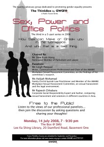 The ThinkBox by AWARE is a public forum series that encourages open dialogue between professionals, academics, and students about current events. The upcoming session, “Sex, Power, and Office Politics,” will cover how sex can make or break you in the workplace, and why that’s a bad thing. Professional panelists will review the recent findings of an AWARE report on workplace sexual harassment, and discuss how companies, the government, organizations, and individuals can work together to overcome this problem. The goal of this ThinkBox is to give the public an opportunity to become part of the solution to eradicating sexual harassment from Singapore.