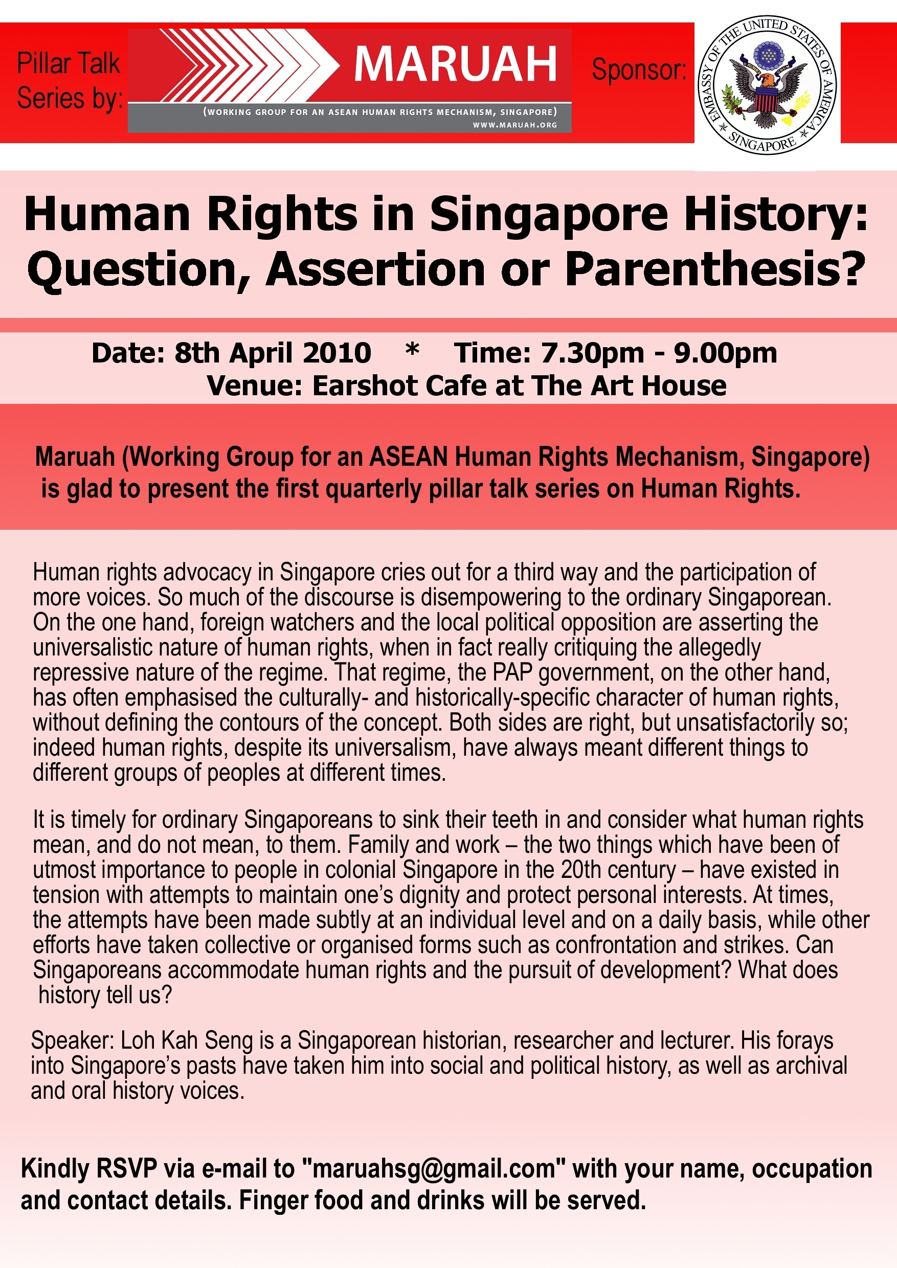As space is limited, kindly RSVP via email to “maruahsg@gmail.com” with your name, occupation and contact details.