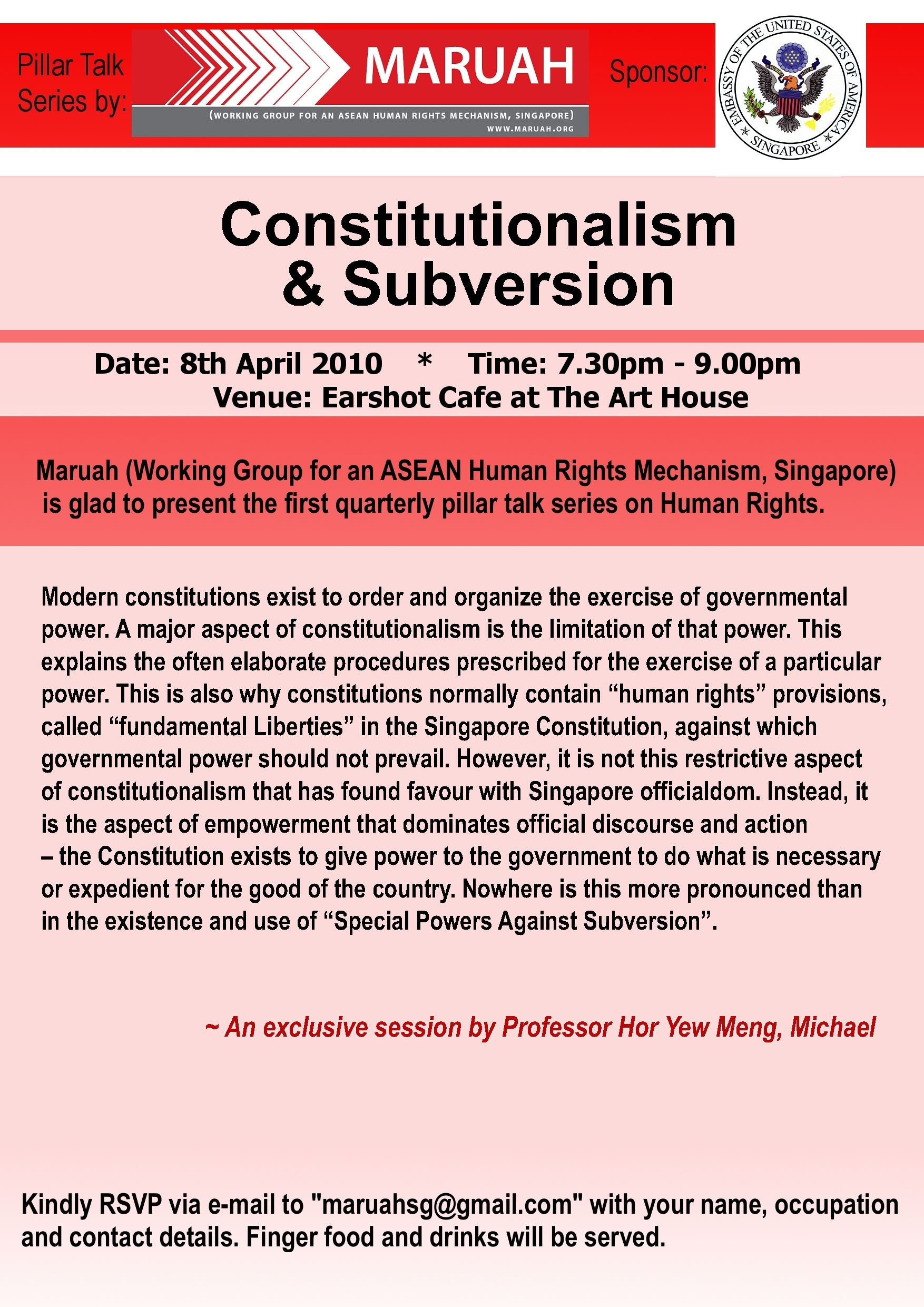 Due to unforeseen circumstances, we regret to inform you that the talk by Dr Loh Kah Seng has been cancelled. But we are pleased to inform you that we have another stimulating discussion for our inaugural launch of the Pillar Talks. We are grateful to Professor Michael Hor who will present a discussion on Constitutionalism & Subversion. Please see attached flyer. We hope you will support this event and be part of the discussion.