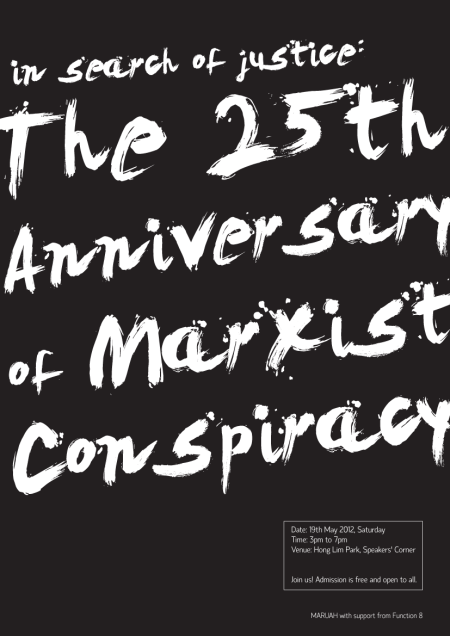 So join us at Speakers’ Corner this Saturday [19th May 2012, 4pm] to commemorate the 25th anniversary of the ISA arrests under the alleged Marxist conspiracy. There will be an exhibition, booths, and sharing sessions by ex-detainees and civil society representatives. More details at the event website.