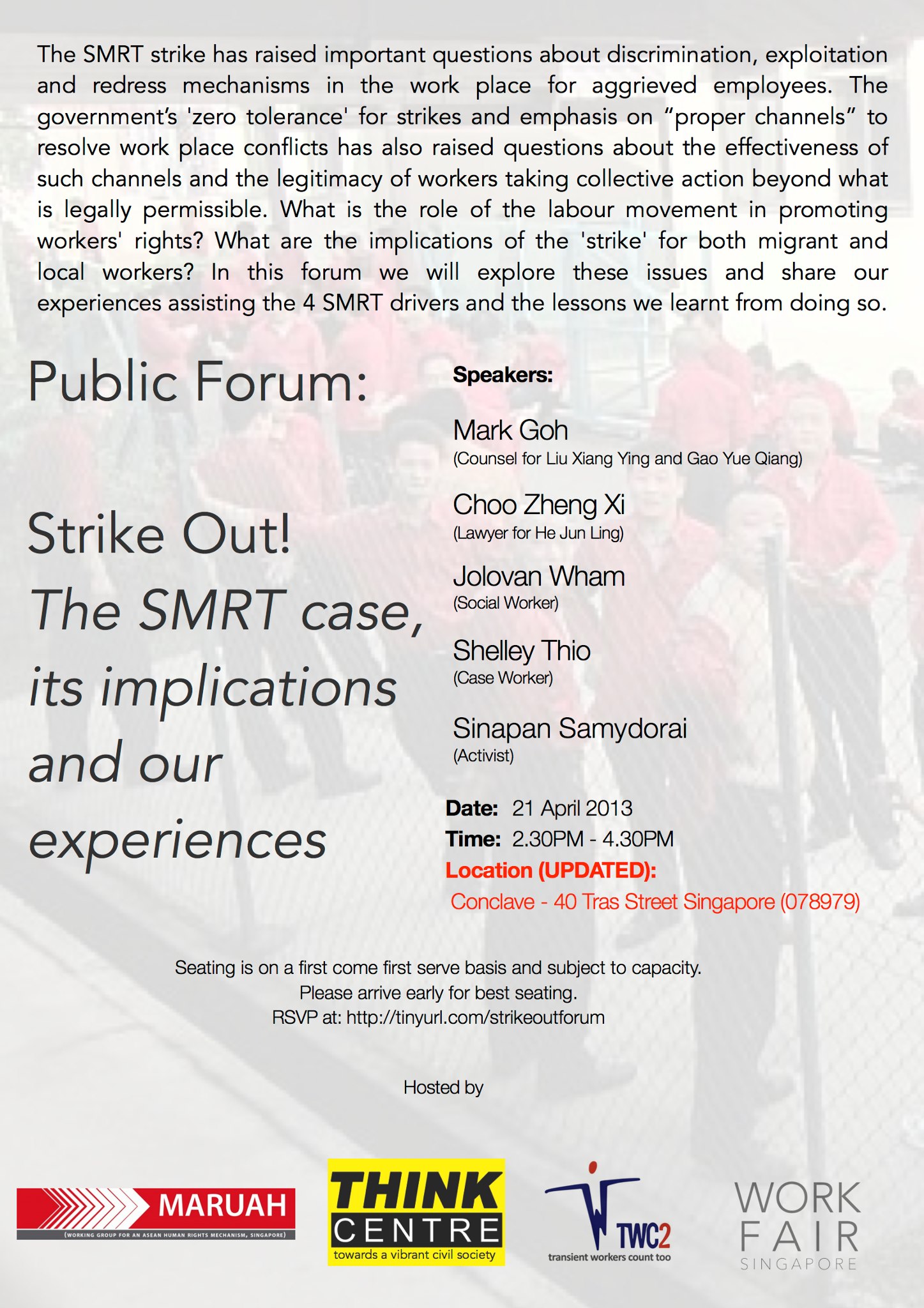 Join us at a public forum to discuss the recent SMRT strike, and its impact on human rights in Singapore.