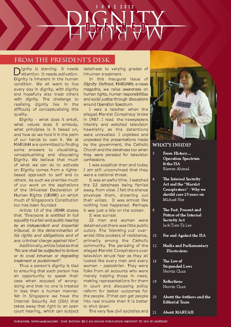 We are delighted to present the first issue of Dignity Defined, MARUAH’s newsletter. In this issue, we put the spotlight on the Internal Security Act (ISA), and the ISA arrests in 1987/88.