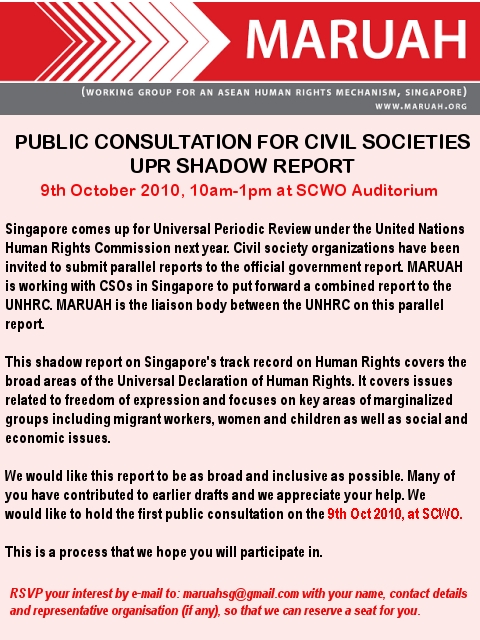 Singapore comes up for review under UPR next year. Civil Society organisations (CSOs) have been invited to submit parallel reports (known as ‘Shadow Reports’) to the government report. MARUAH is working with CSOs to put forward a combined report to the UN Human Rights Council.