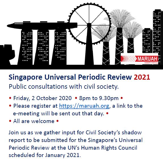 In October 2020, MARUAH submitted its Stakeholder’s Report for the third cycle of the Universal Periodic Review focusing on civil and political rights – Freedom of Expression, Freedom of Association, Censorship, Electoral System, Justice (incl minimum working age, corporal punishment, juvenile justice system & death penalty) and Discrimination (incl LGBTQIA, equality of races, women and income inequalities/job opportunities).