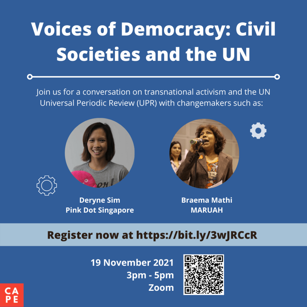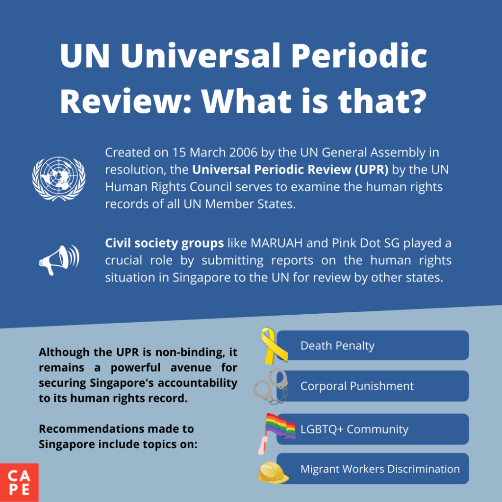 Ever wondered what the UPR was? Every few years, the Universal Periodic Review (UPR) by the United Nations Human Rights Council sets about examining the human rights records of all UN Member States. Join changemakers from Pink Dot and MARUAH for an online panel discussion about the role of the UPR in Singaporean advocacy, policymaking and discourse this Friday, Nov 19, from 3pm-5pm! Proudly organised by the Yale-NUS/NUS Community for Advocacy and Political Education (CAPE)